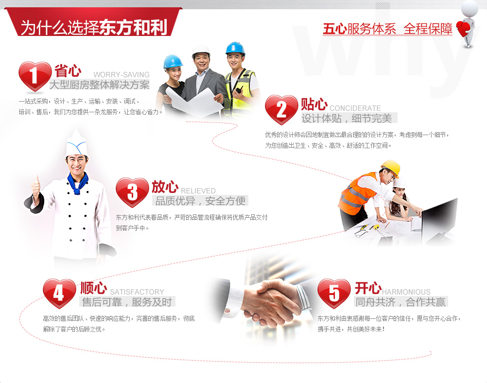 廚房工程建設(shè)是一項龐大復(fù)雜的系統(tǒng)工程,既需要與后勤工作人員、廚師溝通協(xié)調(diào), 又要與土建、裝修、機電、暖通等工程人員相互配合,工作量十分巨大。同時還要采購眾多的食品機械、工具,這對沒有相關(guān)經(jīng)驗的我們來說確實是一個挑戰(zhàn)。有時候我們面對廚師提出的長長的采購需求清單就已經(jīng)眼花繚亂了。 幸好東方和利提供的是整體解決方案,從前期的設(shè)計咨詢到后期的安裝調(diào)試、從大型設(shè)備到餐具小件,包括各種食品機械,排煙通風,這些瑣碎事情都由東方和利來完成,為我們提供量身定制的解決方案。一站式采購為我們節(jié)省了大量精力,而且所有廚具都由東方和利來保修,對我們來說也更加方便。總之,東方和利的服務(wù)讓我們非常省心,我很滿意。